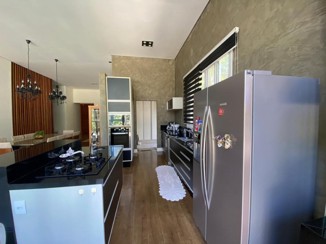 A varanda gourmet, integrada à cozinha, é separada por portas de vidro deslizantes e conta com churrasqueira a carvão e bancada com cooktop. No piso inferior, há uma piscina de 9m x 6m com prainha, cascata, aquecimento solar e iluminação LED, além de uma segunda área gourmet com churrasqueira a gás.