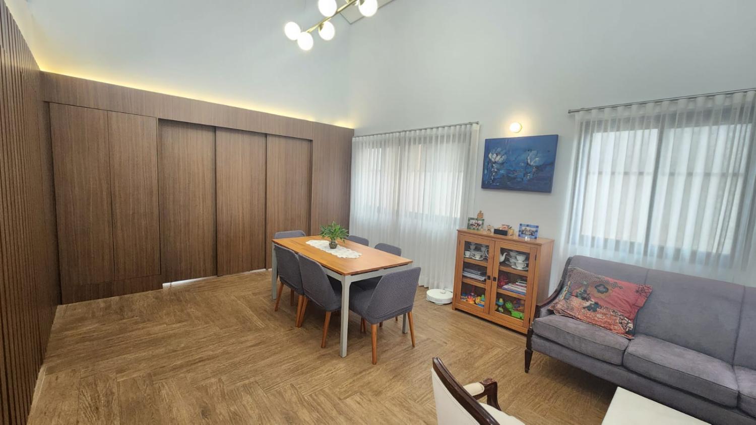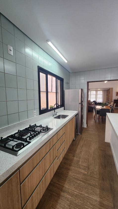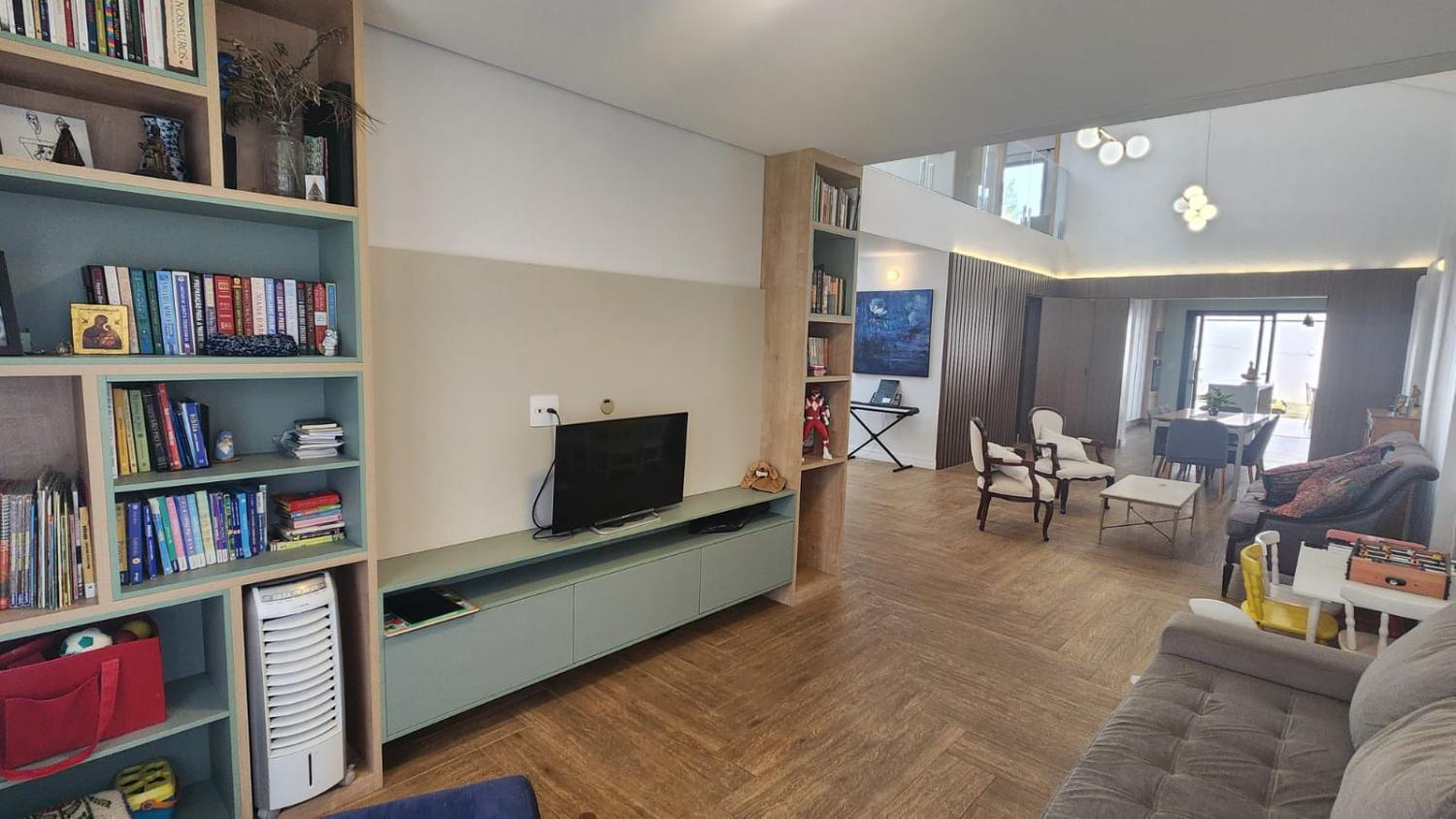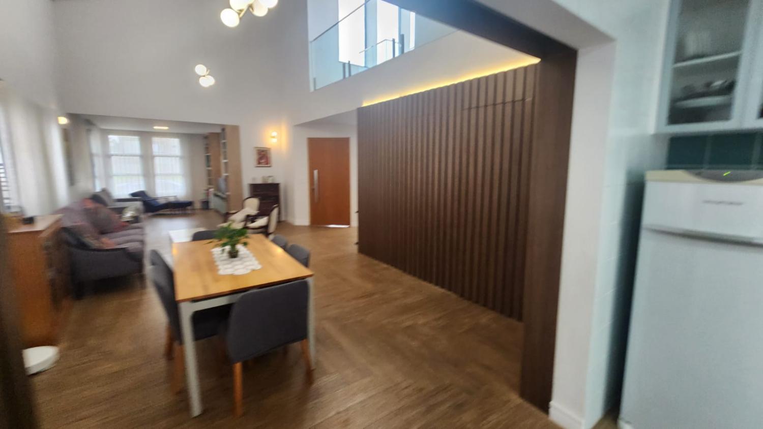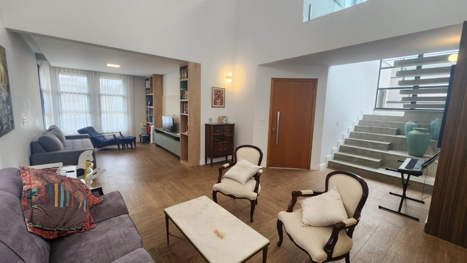 Sala de estar e sala de jantar com pé direito duplo e integradas com a cozinha com ilha, repleta de armários, despensa, lavanderia, banheiro externo