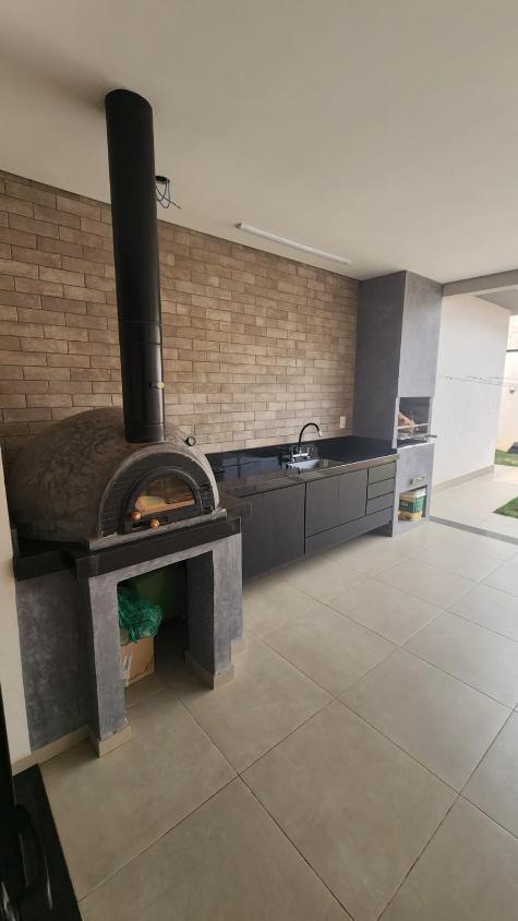 Varanda gourmet com churrasqueira e forno de pizza, quintal com espaço para colocar piscina, corredor lateral e depósito na garagem
