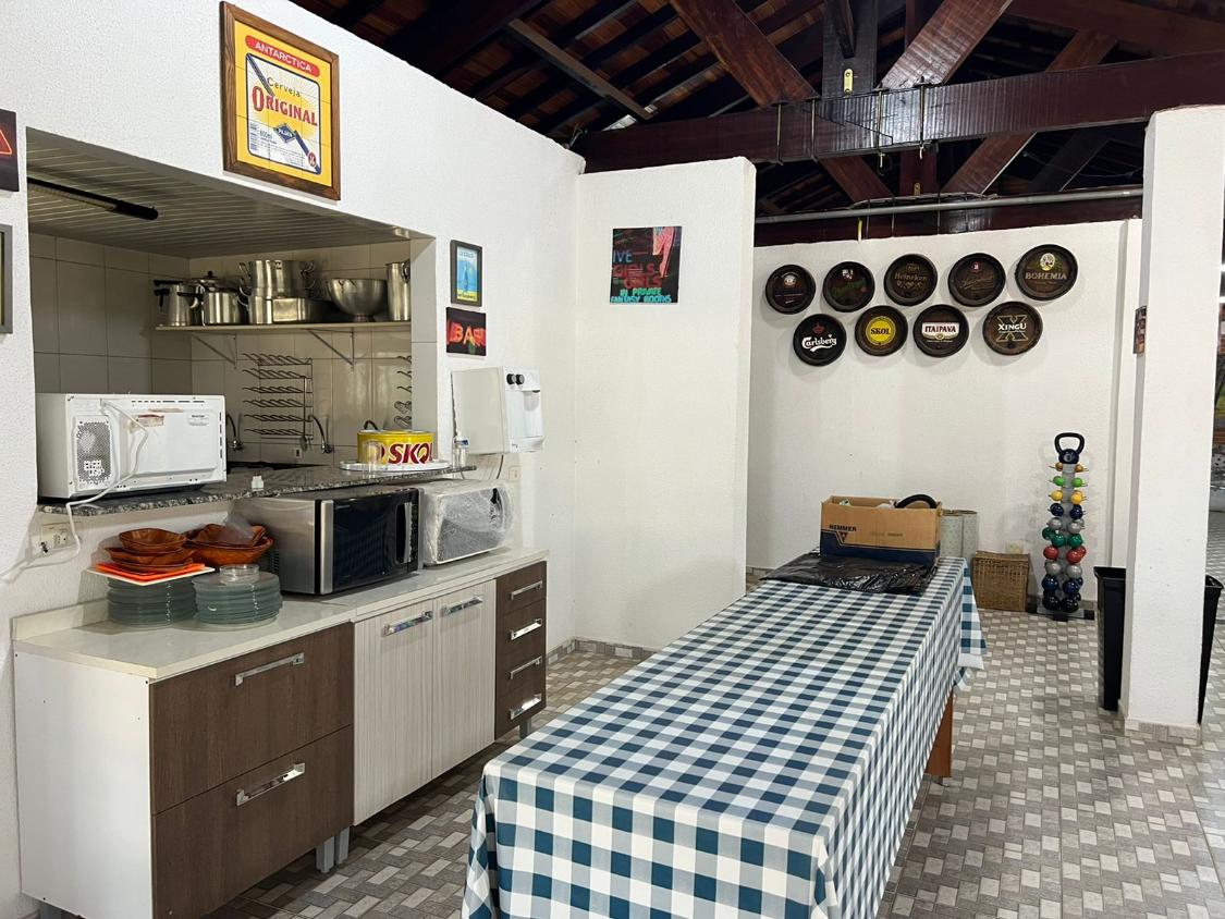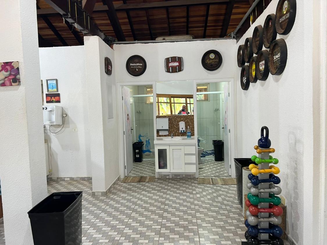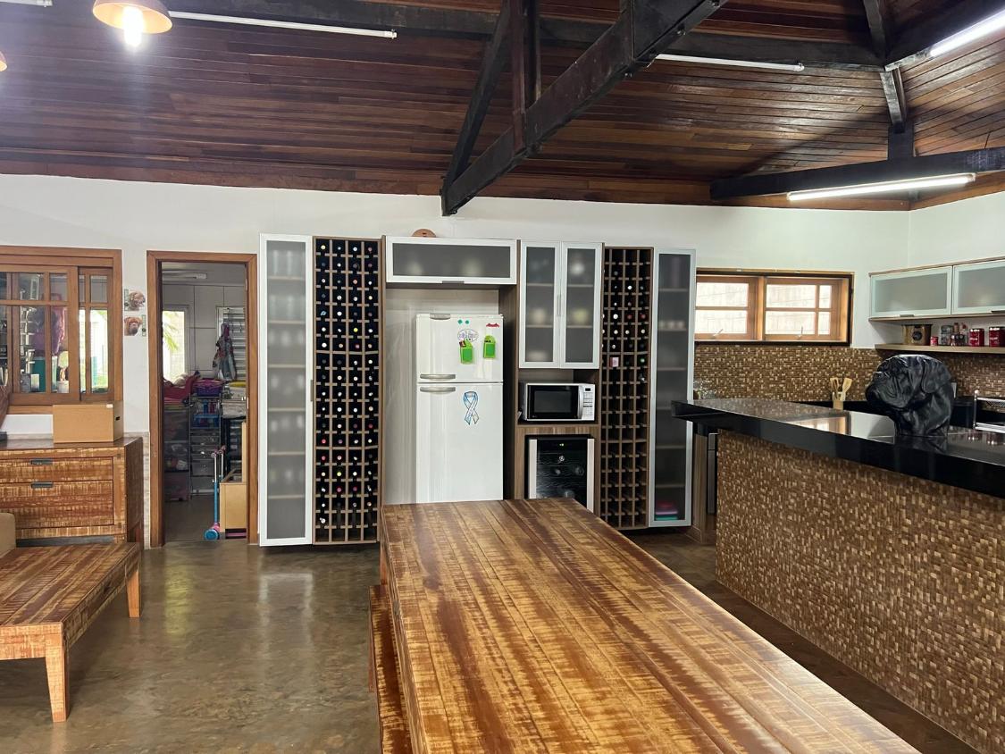 Salão de festa com varanda, contendo mesa de bilhar oficial, cozinha industrial com fogão, forno, bancadas de granito, pias duplas em inox, banheiro masculino e feminino, salão com anexo com churrasqueira grande com pia de apoio em um amplo espaço coberto com estrutura de sapê, com mesas, cadeiras, sofás, geladeiras, freezers de bebida, micro-ondas, projetor e telão instalados, toda infraestrutura de cabeamento de som instalada e nova, toda parte elétrica nova totalmente independente dos demais ambientes e telhado novo.