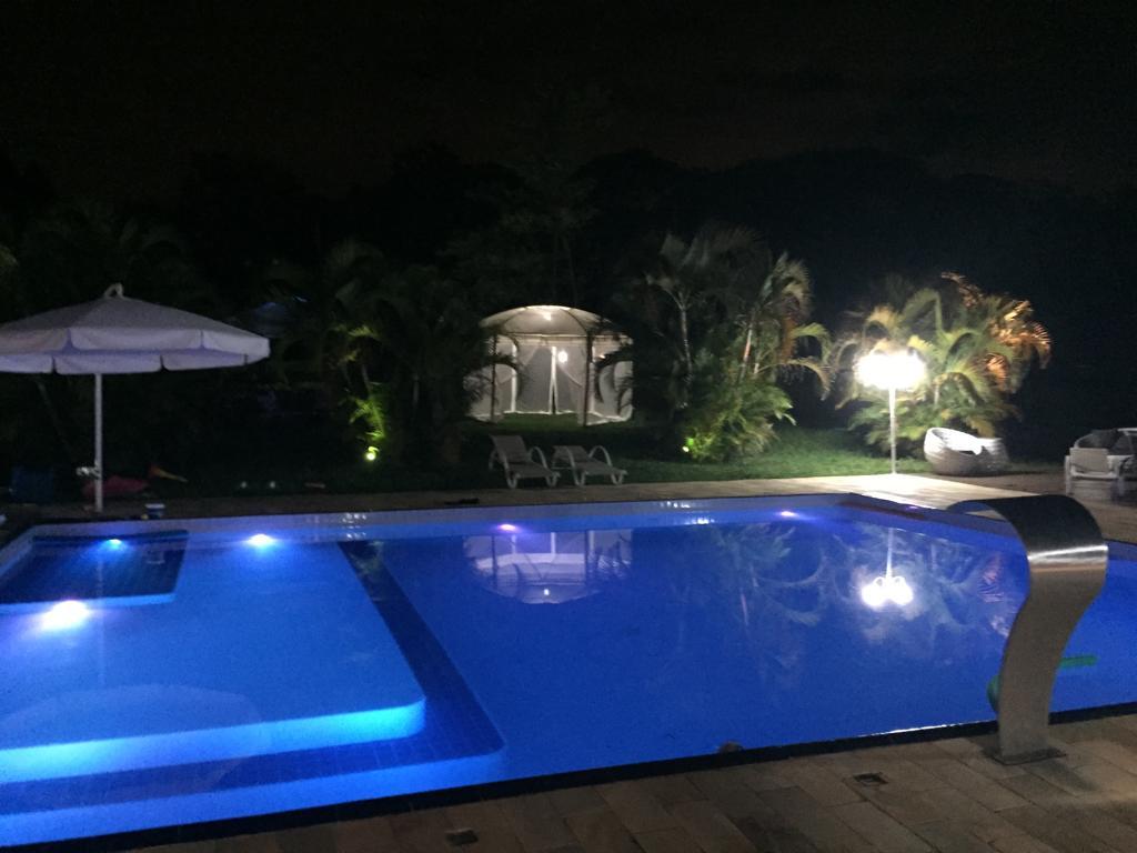 Piscina 10 x 10mts azulejada, aquecimento solar, com iluminação Led, cascata, com sistema de dupla filtragem. Deck de madeira, com bangalôs, guarda sol, chaise, sofás, poltronas, cadeiras tudo fabricados com estrutura reforçada de alumínio com revestimento de fibra sintética, guarda corpo com estrutura de alumínio branco e vidro.